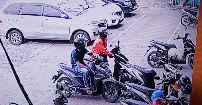 Dalam rekaman CCTV tersebut, terlihat dua Pria datang berboncengan menggunakan sepeda motor. Salah satunya mengenakan jaket orange, sementara Rekannya memakai kaos hitam. Tanpa rasa takut, Mereka berhenti di depan deretan motor yang terparkir. Salah seorang pelaku kemudian turun, beraksi cepat membongkar kunci stang motor incarannya. Hanya dalam hitungan detik, motor milik korban yang apes itu berhasil dinyalakan, dan keduanya langsung kabur membawa hasil curian.