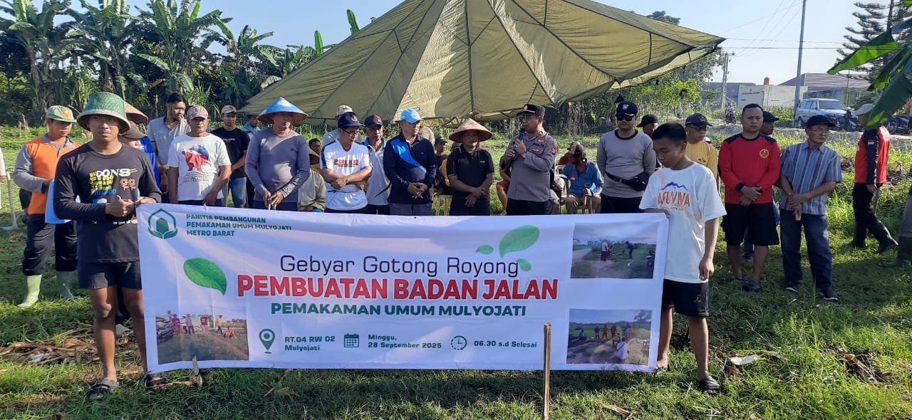 Metro djurnalis.com – Personel Polsek Metro Barat bersama masyarakat melaksanakan kegiatan gotong royong pembangunan badan jalan menuju calon pemakaman umum di Kelurahan Mulyojati, Kecamatan Metro Barat, Kota Metro, Minggu (28/9/2025).