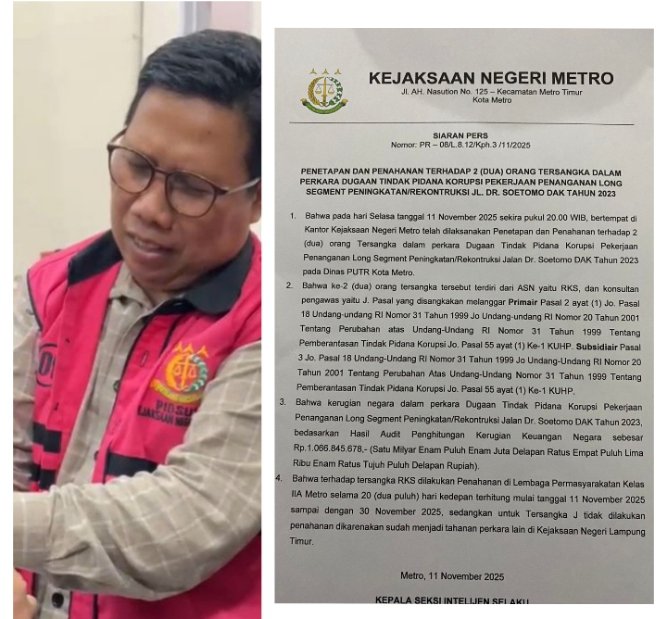 Metro djurnalis.com- Kejaksaan Negeri Kota Metro resmi menetapkan kembali Mantan Kepala Dinas Pekerjaan Umum dan Tata Ruang (PUTR) Robby Kurniawan Saputra Kota Metro sebagai Tersangka kasus dugaan korupsi proyek pembangunan Jalan Dr. Sutomo yang bersumber dari anggaran APBD tahun 2023. Selasa malam 11/11/2025.